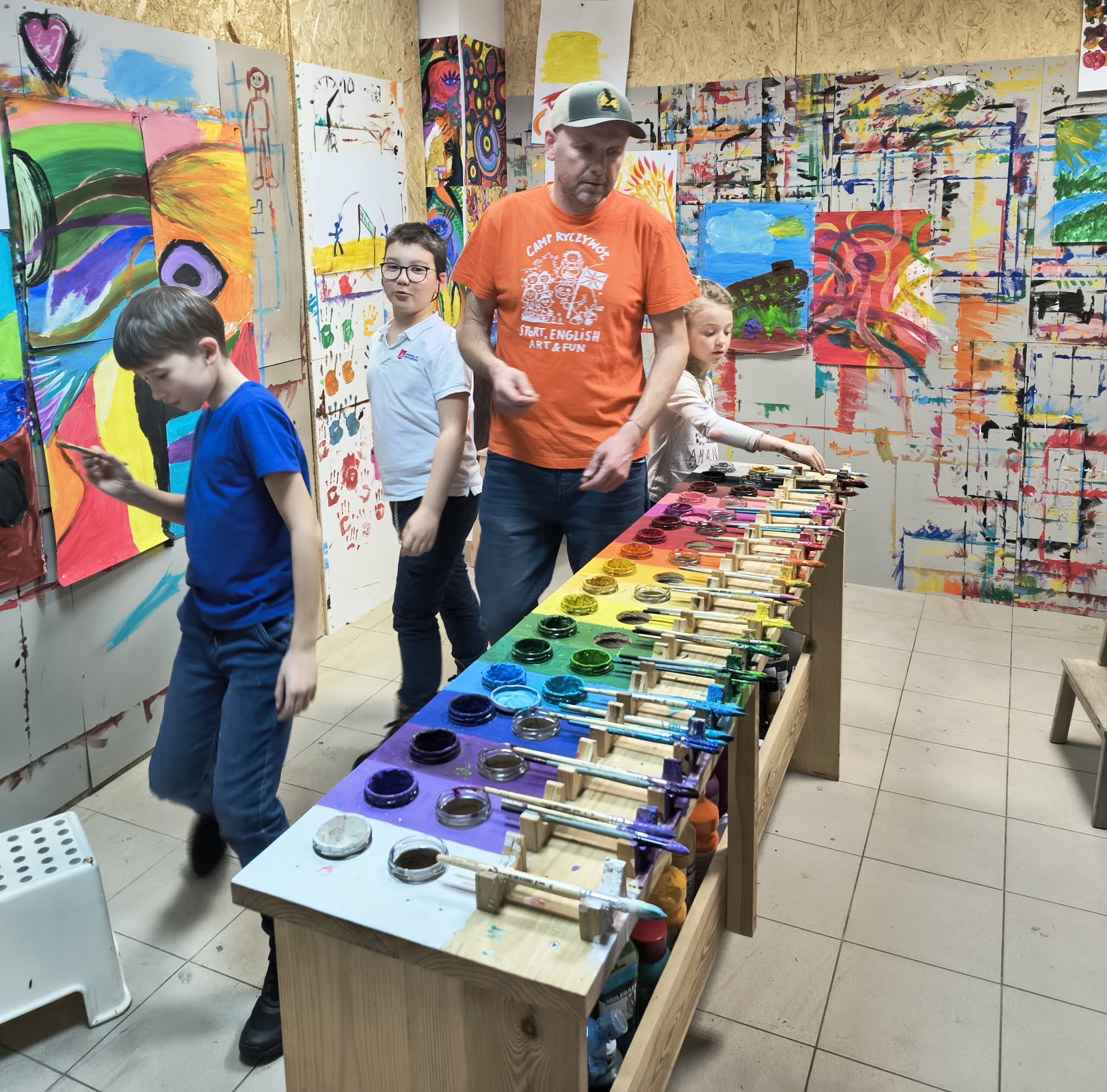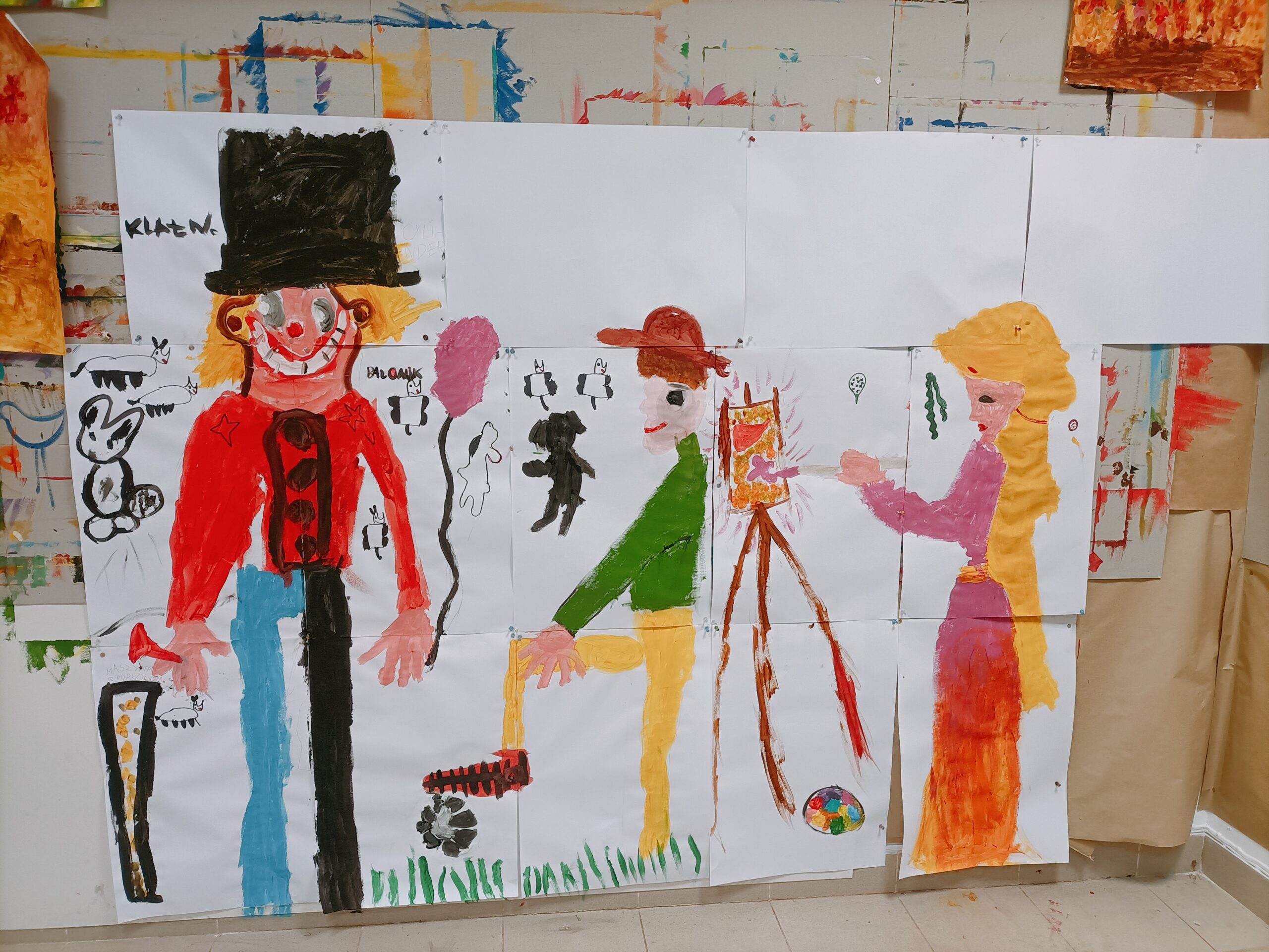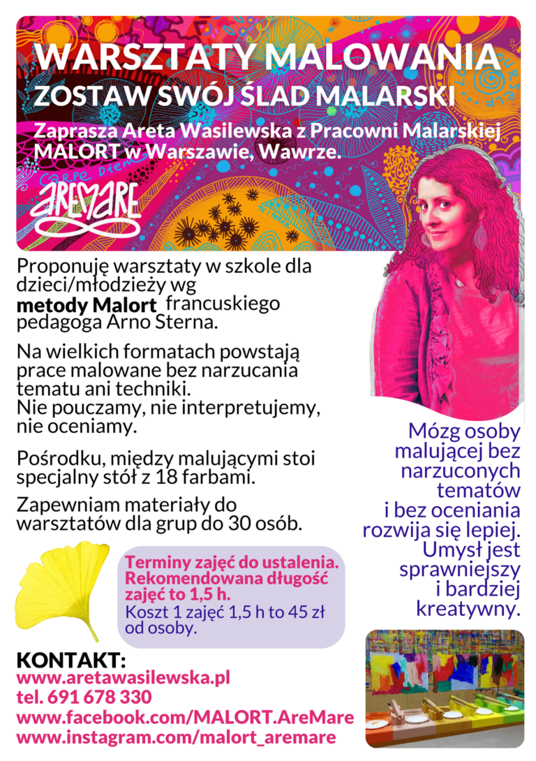 Proponuję 90 minutowe warsztaty w szkole dla dzieci/młodzieży. Na wielkich formatach powstają prace malowane bez narzucania tematu czy techniki. Zostawiamy swój ślad malarski. Nie pouczamy, nie interpretujemy, nie oceniamy. Pośrodku, między malującymi stoi specjalny stół z 18 farbami.